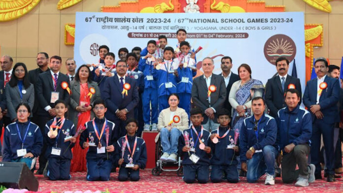 जयपुर। 67वें राष्ट्रीय शालेय खेल ( योगासन,14 वर्ष तक की आयु श्रेणी के बालक एवं बालिका) 2023-24 का समापन समारोह विभिन्न रंगारंग कार्यक्रमों के साथ उर्जित परिवेश में हर्षोल्लास के साथ रविवार को केन्द्रीय विद्यालय एक बजाज नगर जयपुर में सम्पन्न हुआ।