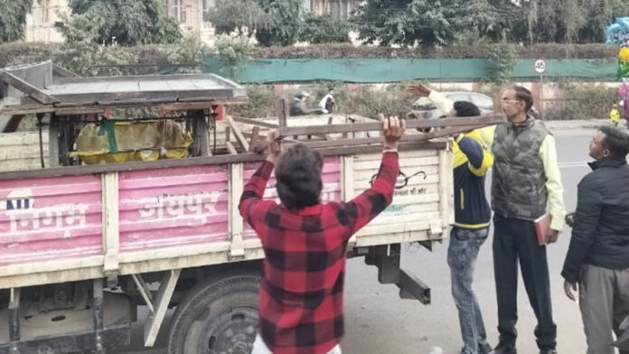 जयपुर। नगर निगम जयपुर के उपायुक्त सतर्कता के नेतृत्व में मंगलवार को सतर्कता शाखा की द्वारा नगर निगम जयपुर क्षेत्राधिकार में जय क्लब, एसएमएस, ट्रोमा, अजमेरी गेट के पास, पाश्र्वनाथ काॅलोनी अजमेर रोड़ चित्रकुट के पास सेक्टर-1 व 2 के मध्य एवं कूकरखेड़ा मण्डी से टोडी मोड़ सीकर रोड, जौहरी बाजार, सांगानेरी गेट, मीना मार्केट, घाटगेट, गोविंद मार्ग, पिंक स्क्वायर मॉल क्षेत्र, ब्रह्मपुरी कॉलोनी, ट्रांसपोर्ट नगर, रोटरी सर्किल सर्विस लाइन, दिल्ली रोड, जवाहर नगर, आदर्श नगर, आगरा रोड, पुरानी चुंगी आगरा रोड, हाई कोर्ट, सहदेव मार्ग, सांगानेरी रोड, रेलवे सर्किल, भगवान दास रोड, सी-स्कीम, पंचबत्ती चैराहा सहित त्रिपोलिया बाजार तक आदि स्थानों से अस्थाई अतिक्रमण करने वालों के विरुद्ध 1 लाख 21 हजार 500 रुपये का कैरिंग चार्ज वसूल कर 16 केन्टर सामान जब्त किया गया।