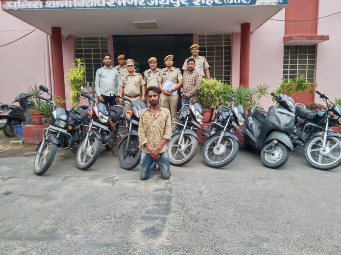 जयपुर। विद्याधर नगर थाना पुलिस ने कार्रवाई करते हुए एक शातिर वाहन चोर को गिरफ्तार किया हैं। जिसके पास से पुलिस ने चोरी के सात दुपहिया वाहन बरामद किये हैं। आरोपित ने यह सभी चोरी की वारदात विद्याधर नगर,संजय सर्किल,शास्त्री नगर, मुरलीपुरा थाना इलाके में करना कबूल किया हैं। नशे के लिए आरोपित वाहन चोरी की वारदात करता था। फिलहाल आरोपित से पूछताछ की जा रही है।