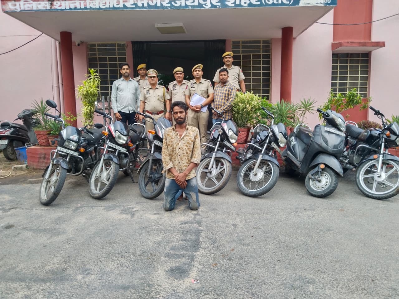 पुलिस उपायुक्त जयपुर उत्तर करण शर्मा ने बताया कि विद्याधर नगर थाना पुलिस ने कार्रवाई करते हुए एक शातिर वाहन चोर मोहम्मद शाहिद कुरैशी उर्फ शानू निवासी शास्त्री नगर जयपुर को गिरफ्तार किया हैं। जिसके पास से चोरी के सात दुपहिया वाहन बरामद किये हैं। पुलिस पूछताछ में और भी कई वारदातें खुलने की आशंका जताई जा रही है।