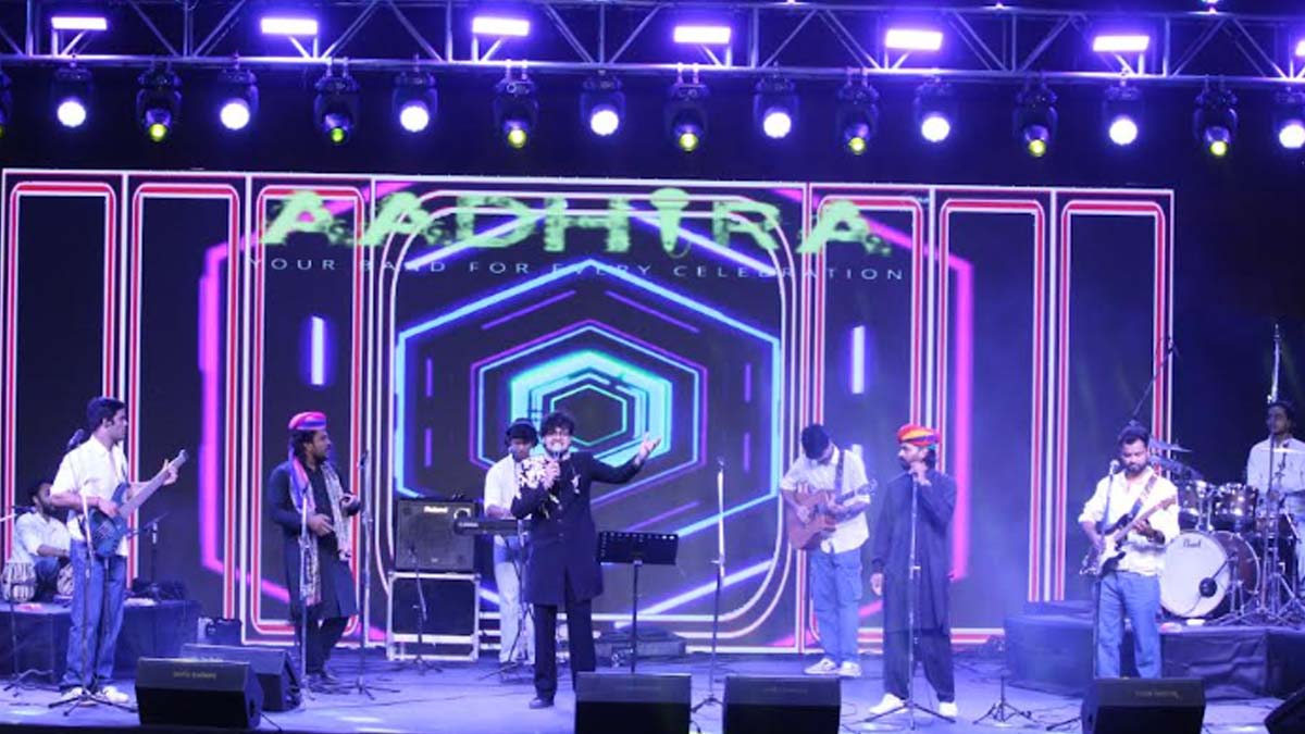 कार्यक्रम की शुरुआत आधीरा के मुख्य गायक विक्की खंडेलवाल की सुरीली आवाज़ में प्रस्तुत प्रसिद्ध गीत “कदी आओ नी रसीला म्हारे देश” से हुई। इसके बाद एक के बाद एक रंगारंग प्रस्तुतियों ने श्रोताओं को बांधे रखा। “बन्ना री लाल पीली अंखियां” और “बोले तो मीठो लागे, हँसे तो प्यारो लागे” जैसे लोकप्रिय राजस्थानी गीतों को जब फ्यूजन अंदाज़ में पेश किया गया तो तालियों की गड़गड़ाहट से पूरा मुक्ताकाशी मंच गूंज उठा। लोक और आधुनिकता के संगम के साथ-साथ बैंड ने भक्ति रस की प्रस्तुतियां भी दीं जिसमें दुर्गा मां की स्तुति से वातावरण भक्तिमय हो गया।