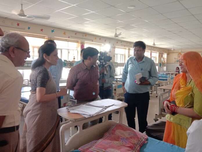 जयपुर। चिकित्सा एवं स्वास्थ्य विभाग की अतिरिक्त मुख्य सचिव शुभा सिंह ने सोमवार को राजकीय जयपुरिया अस्पताल का आकस्मिक निरीक्षण किया और हीटवेव प्रबंधन सहित अन्य व्यवस्थाओं का जायजा लिया। उन्होंने अस्पताल में साफ-सफाई व्यवस्था समुचित नहीं मिलने पर नाराजगी व्यक्त की और सख्त एक्शन लेते हुए अस्पताल अधीक्षक को कारण बताओ नोटिस जारी करने के निर्देश दिए। साथ ही, दो नर्सिंग अधिकारियों को सीसीए नियम-17 के तहत नोटिस देने के निर्देश दिए।