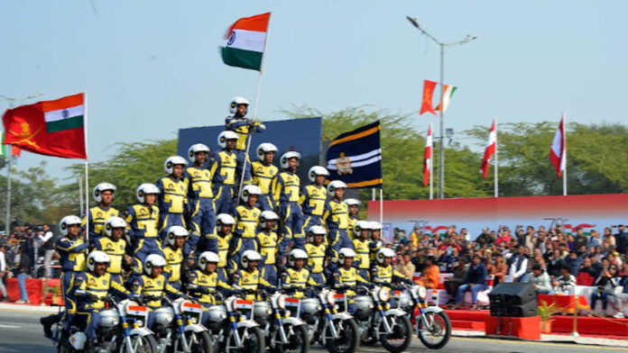 वहीं, अपाचे, प्रचंड और चेतक हेलिकॉप्टरों की उड़ानों ने दर्शकों को रोमांचित किया। इसी प्रकार, भारतीय सेना के जवानों ने मोटरसाइकिल पर पिरामिड निर्माण, एक टायर पर सवारी तथा अशोक स्तंभ और कमल जैसे राष्ट्रीय प्रतीकों का प्रदर्शन कर दर्शकों को मंत्रमुग्ध कर दिया।