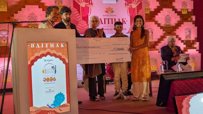 जयपुर। जयपुर लिटरेचर फेस्टिवल (जेएलएफ) में स्वर्गीय सविता माली की स्मृति में द पोएट्री ऑफ रिमेंबरेंस सत्र के दौरान पहले समाई ग्रांट फॉर क्रिएटिव राइटिंग’ पुरस्कार की घोषणा की गई। यह पहला पुरस्कार राजस्थान के युवा कवि और लेखक विजय राही को प्रदान किया गया, जिसके तहत उन्हें 25 हजार रुपए की इनाम राशि का चैक प्रदान किया गया।
