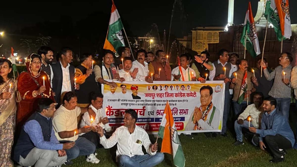 जयपुर। जयपुर शहर जिला कांग्रेस कमेटी के अध्यक्ष आर आर तिवाड़ी के नेतृत्व में राजस्थान की भाजपा सरकार द्वारा नगर निकाय एवं पंचायत राज के कार्यकाल खत्म होने के बावजूद चुनाव न कराकर लोकतंत्र की हत्या करने के विरोध में सोमवार की शाम को स्टेचू सर्किल जयपुर पर कैंडल मार्च एवं श्रद्धांजलि सभा का आयोजन किया गया।