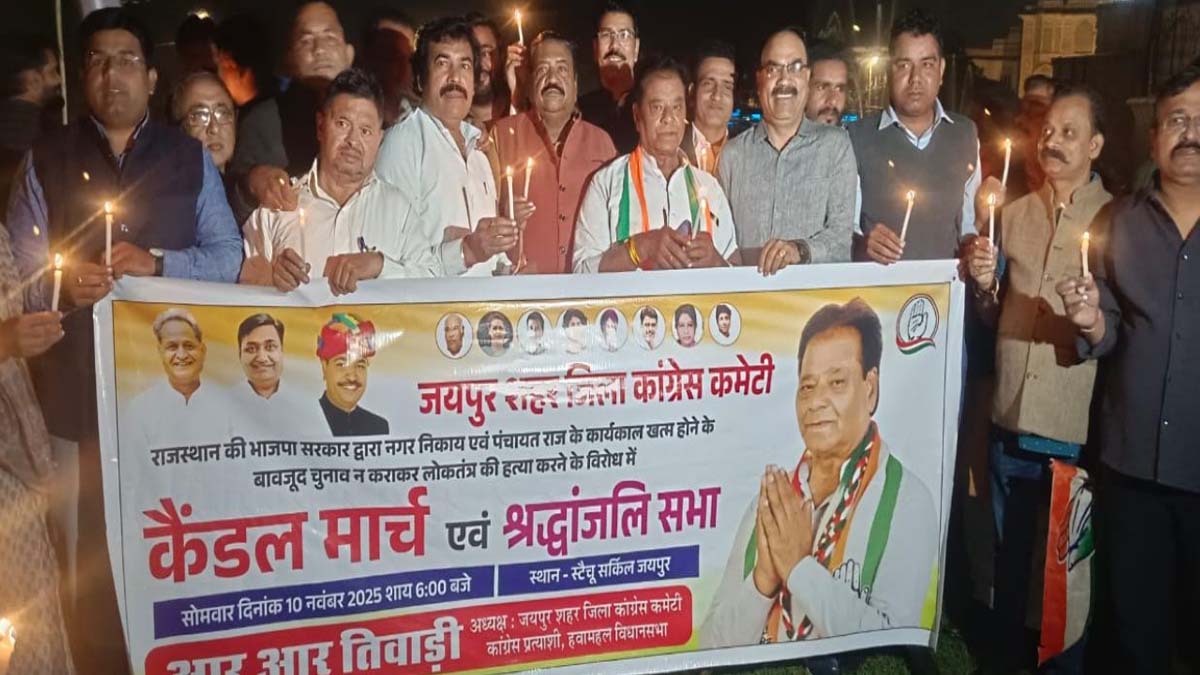 जयपुर। जयपुर शहर जिला कांग्रेस कमेटी के अध्यक्ष आर आर तिवाड़ी के नेतृत्व में राजस्थान की भाजपा सरकार द्वारा नगर निकाय एवं पंचायत राज के कार्यकाल खत्म होने के बावजूद चुनाव न कराकर लोकतंत्र की हत्या करने के विरोध में सोमवार की शाम को स्टेचू सर्किल जयपुर पर कैंडल मार्च एवं श्रद्धांजलि सभा का आयोजन किया गया।