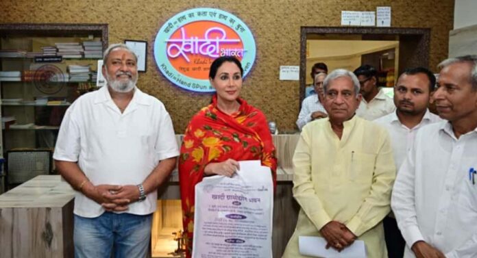 जयपुर। उपमुख्यमंत्री दिया कुमारी ने बजाज नगर स्थित खादी ग्रामोद्योग भवन में पहुँचकर खादी उत्पादों की खरीदारी की और आमजन को स्वदेशी अपनाने का संदेश दिया। उन्होंने खादी वस्त्रों का अवलोकन करते हुए कहा कि “हमें विदेशी उत्पादों की बजाय देश में बने हुए स्वदेशी वस्तुओं को प्राथमिकता देनी चाहिए।”