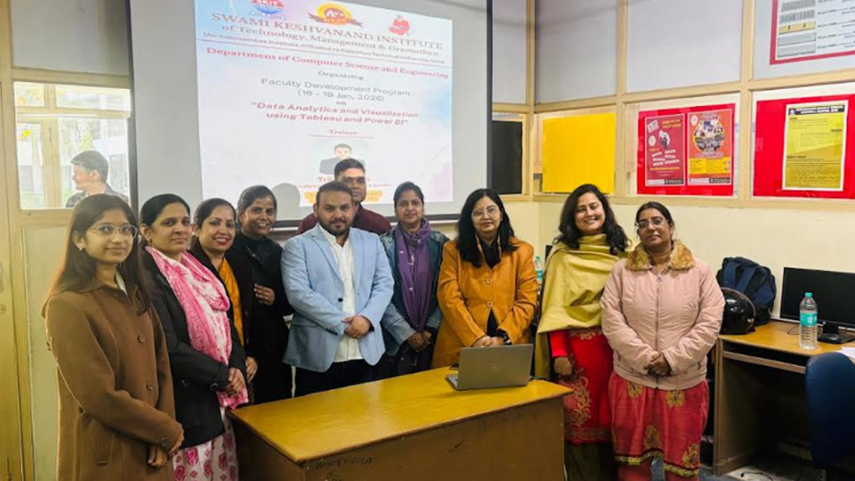 जयपुर। एसकेआईटी जयपुर के कंप्यूटर साइंस एंड इंजीनियरिंग (सीएसई) डिपार्टमेंट द्वारा “डेटा एनालिसिस और विज़ुअलाइज़ेशन यूज़िंग पावर बीआई और टेबल्यू” विषय पर आयोजित फैकल्टी डेवलपमेंट प्रोग्राम (एफडीपी) का शुभारंभ 16 जनवरी 2026 को किया गया। इस एफडीपी का प्रशिक्षणत्रिलोक सिंह, सीनियर बिज़नेस एनालिस्ट द्वारा दिया जा रहा है, जिसका उद्देश्य डिपार्टमेंट के सदस्यों को आधुनिक डेटा एनालिटिक्स और विज़ुअलाइज़ेशन टूल्स में व्यावहारिक दक्षता प्रदान करना है।