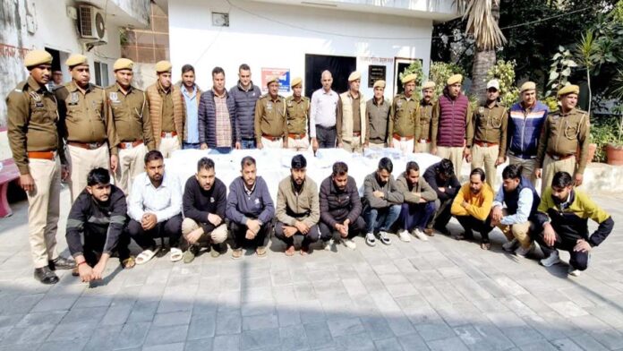 छापेमारी के दौरान संदीप कुमार (35) निवासी झुंझुनूं हाल चौमूं पुलिया के पास जयपुर,बलबीर (35) निवासी सूरतगढ जिला गंगानगर हाल चौमूं पुलिया के पास जयपुर,कश्मीर झांझड़िया (25) निवासी झुंझुनूं हाल चौमूं पुलिया जयपुर,नितेश कुमार (27) निवासी राजगढ़ हमीरवास जिला चूरू हाल मानसरोवर,सुमित सिंह (25) निवासी महेंद्रगढ़ हरियाणा हाल मानसरोवर,जोरावर सिंह मीणा (22)निवासी माउन टाउन जिला सवाईमाधोपुर हाल निवासी जगतपुरा जयपुर,मनीष कुमार (22), निवासी बगड़ जिला झुंझुनूं,खुशीराम (24) निवासी फागी जिला जयपुर,नवीन सारण (25) निवासी नागौर,अंकित कुमार (23) निवासी मालसर जिला गंगानगर,प्रवीण यादव (29) निवासी तिजारा जिला अलवर,मुकेश कुमार मीणा (28) निवासी आमेर जयपुर,टिंकू चौधरी उर्फ गुरुजी (32) निवासी अमरसर जिला जयपुर और रूपम पचार (26) निवासी सीकर को गिरफ्तार किया गया है।