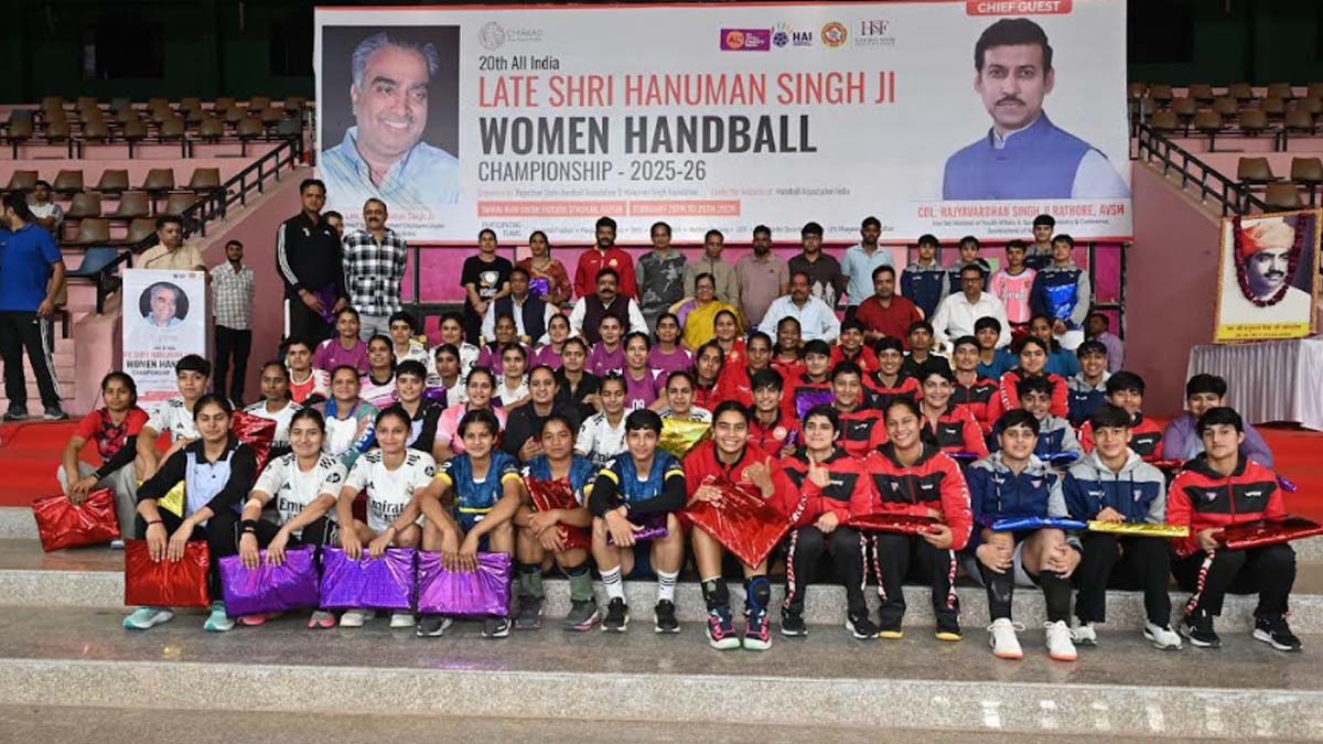जयपुर। जयपुर सांसद मंजु शर्मा ने सवाई मान सिंह स्टेडियम पर खेली जा रही तीन दिवसीय 20वी ऑल इंडिया हनुमान सिंह महिला हैंडबॉल चैंपियनशिप-2025-26 के दूसरे दिन प्रतियोगिता में भाग ले रही 58 अंतरराष्ट्रीय खिलाड़ियों का स्मृति चिह्न देकर सम्मान किया। साथ ही सभी दस टीमों के प्रशिक्षकों का भी सम्मान किया गया। इस अवसर पर श्री राजपूत सभा, जयपुर के अध्यक्ष राम सिंह चंदलाई, राज्य हैंडबॉल संघ के संरक्षक जय आहुजा, महेंद्र शर्मा, हैंडबॉल के गुरु वशिष्ठ अवार्डी सुब्रत सेन, जयपुर जिला हैंडबॉल संघ के संरक्षक अशोक कुमार शर्मा भी मौजूद थे।