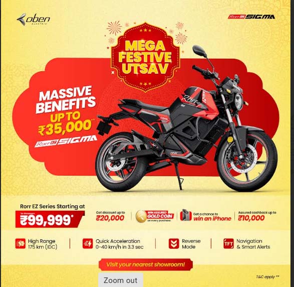 त्योहारों के इस ऑफर के तहत रोर ईजी सिग्मा या रोर ईजी खरीदने वाले कस्टमर्स को ₹20,000 का सीधा लाभ मिलेगा, जो पहले से ही कीमत में शामिल है। इसके अलावा कस्टमर्स को ₹10,000 तक का कैशबैक और हर खरीद पर पक्का गोल्ड कॉइन भी दिया जाएगा। इसके अलावा एक लकी कस्टमर को i आईफोन जीतने का मौका भी मिलेगा।