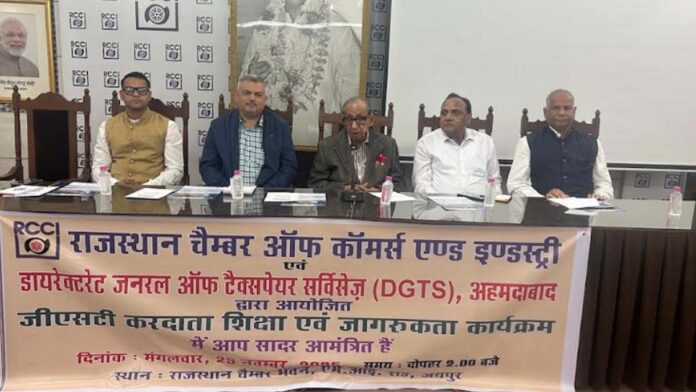 जयपुर। राजस्थान चैंबर ऑफ कॉमर्स एंड इंडस्ट्री एवं डायरेक्टरेट जनरल ऑफ टैक्सपेयर सर्विसेज (डीजीटीएस), अहमदाबाद के संयुक्त तत्वावधान में मंगलवार को “जीएसटी करदाता शिक्षा एवं जन जागरूकता कार्यक्रम” का आयोजन किया गया।