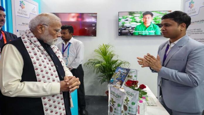 जयपुर। राजस्थान के तीन युवाओं ने कृषि को उन्नत बनाने और पर्यावरण संरक्षण में योगदान निभाने की दिशा में बड़ा कीर्तिमान हासिल किया है। राजसमंद के नारायण लाल गुर्जर, पूरन सिंह राजपूत और जयपुर के अंकित जैन की मेहनत ने स्टार्टअप ईएफ पॉलीमर के रूप में आकार लिया। इन्होंने लंबी रिसर्च के बाद आर्गेनिक सुपर एब्जॉर्बेंट पॉलिमर फसल अमृत तैयार किया है जो फलों के छिलकों के बायोवेस्ट से बना है। राइजिंग राजस्थान में ईएफ पॉलिमर ने हिस्सा लिया। प्रधानमंत्री नरेन्द्र मोदी ने ईएफ पॉलिमर की स्टॉल पर विजिट किया। को फाउंडर अंकित जैन ने पीएम मोदी को प्रोडक्ट की जानकारी दी। पीएम ने फसल अमृत की सराहना की और ऐसे इनोवेटिव स्टार्टअप करने के लिए युवाओं को प्रेरित किया।
