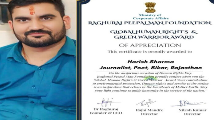 जयपुर/ लक्ष्मणगढ़/ (सीकर)। सीकर जिले के लक्ष्मणगढ़ निवासी व बेटा पढ़ाओ-संस्कार सिखाओ अभियान के संस्थापक,अध्यक्ष,कवि हरीश शर्मा को भारत सरकार के मिनिस्ट्री ऑफ कॉरपोरेट अफेयर्स द्वारा रघुराज पीलमैन फॉउन्डेशन द्वारा ग्लोबल ह्यूमन राइट एंड ग्रीन वारियर अवार्ड से सम्मानित किया गया। शर्मा को यह सम्मान उनके द्वारा किये गए जन जागृति व पर्यावरण बचाने की मुहिम के तहत दिया गया। इस तरह के अवार्ड पर्यावरण व मानवता के लिए उत्कृष्ट कार्य करने वालों को दिये जाते हैं। यह अवार्ड मिलना पूरे क्षेत्र के लिए बहुत बड़े गौरव की बात हैं।