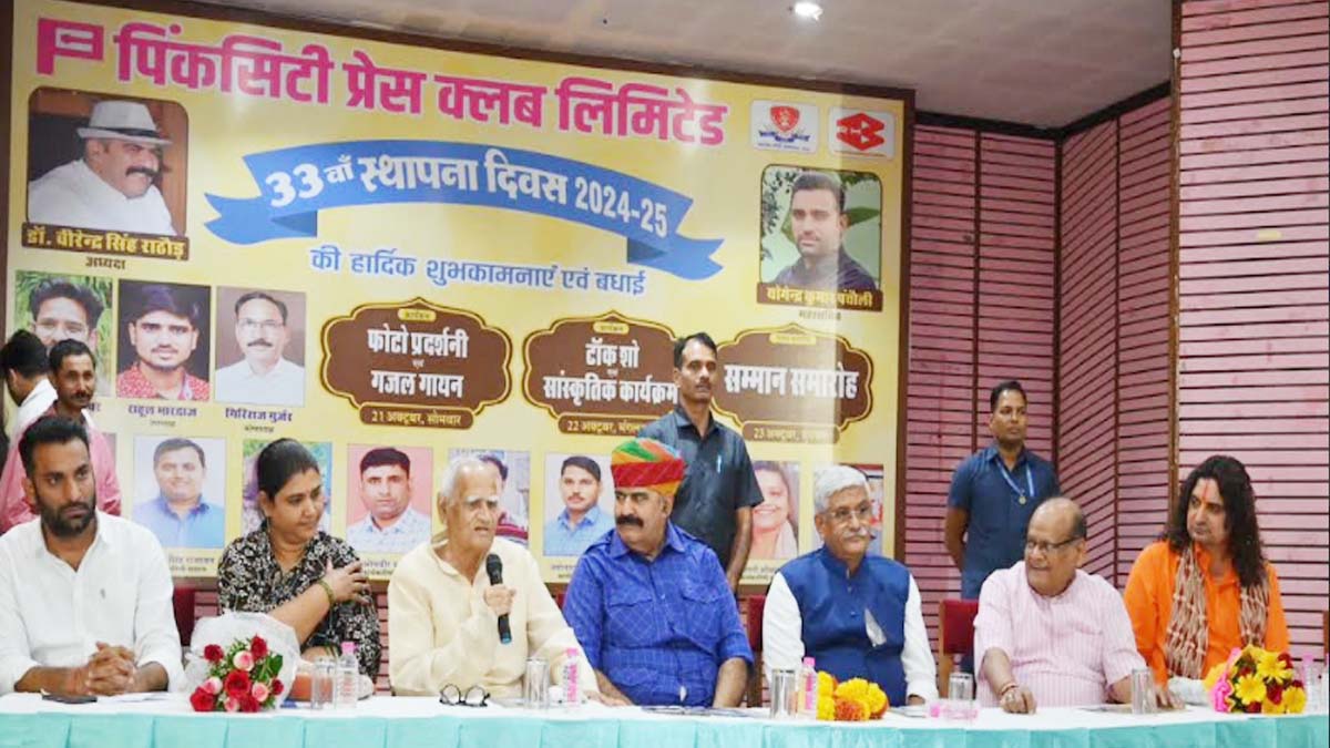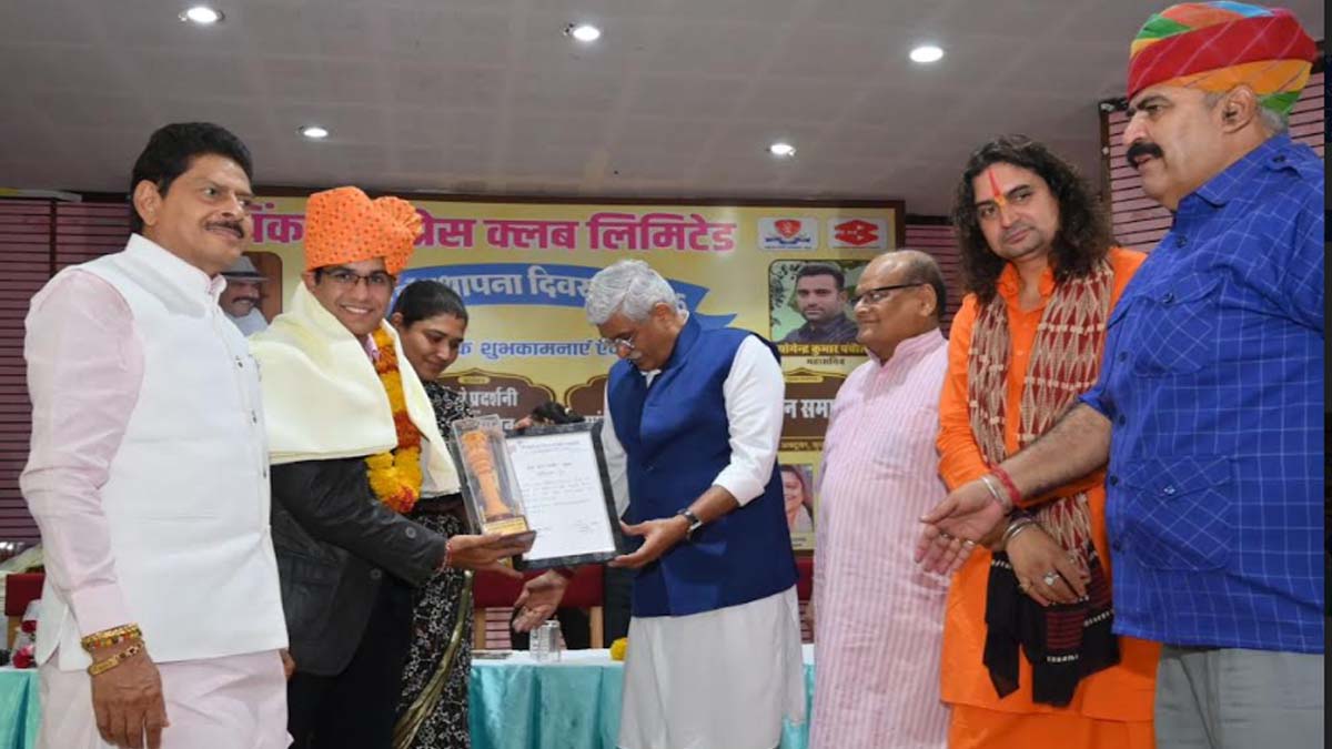 जयपुर। पिंकसिटी प्रेस क्लब के 33वें स्थापना दिवस समारोह में बुधवार को युवा एवं वरिष्ठ पत्रकारों का हुआ सम्मान। समारोह के मुख्य अतिथि पर्यटन एवं सांस्कृतिक केन्द्रीय मंत्री गजेन्द्र सिंह शेखावत, विशिष्ट अतिथि विधायक कालीचरण सरार्फ, गोपाल शर्मा, बालमुकुन्दाचार्य, ऋतु बनावत, भाजपा नेता रवि नैयर क्लब संस्थापक सदस्य प्रवीण चन्द छाबड़ा, क्लब अध्यक्ष डा. वीरेन्द्र राठौड़, महासचिव योगेन्द्र पंचौली ने पत्रकारों को शॉल, साफा, प्रश्स्ति पत्र, स्मृति चिन्ह एवं माला पहनाकर सम्मानित किया।
