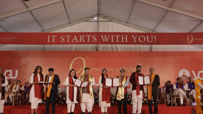 मौका था विवेकानंद ग्लोबल विश्वविद्यालय के 9वें दीक्षांत समारोह का, जो इस वर्ष इसलिए भी विशेष रहा क्योंकि इसी अवसर पर सेंटर फॉर डिस्टेंस एजुकेशन और ऑनलाइन विवेकानंद ग्लोबल विश्वविद्यालय का पहला संयुक्त दीक्षांत समारोह भी आयोजित किया गया। इस भव्य आयोजन में विभिन्न संकायों के स्नातक, स्नातकोत्तर एवं डिप्लोमा के 1,942 विद्यार्थियों तथा 41 शोधार्थियों को पीएचडी की उपाधि प्रदान की गई। . विद्यार्थियों को डिग्रियां प्रदान की गईं। समारोह में विद्यार्थियों के चेहरे पर वर्षों की मेहनत और संघर्ष की संतुष्टि साफ झलक रही थी। अभिभावकों और शिक्षकों के लिए यह क्षण गर्व का था, जब उनके सामने विद्यार्थियों ने शिक्षा की एक महत्वपूर्ण सीढ़ी पार की।