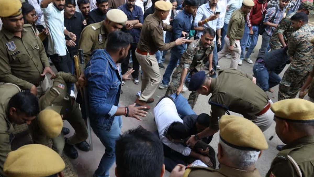 इस दौरान पुलिस और स्टूडेंट्स में जमकर धक्का-मुक्की हो गई। कई छात्र गिर भी गए। पुलिस ने छात्र नेता शुभम रेवाड़ समेत 8 स्टूडेंट्स को हिरासत में लिया। इस कार्रवाई के विरोध में कुछ छात्राएं पुलिस की गाड़ी को रोकने के लिए उसके फ्रंट हिस्से पर चढ़ गईं। वे पुलिस के खिलाफ नारेबाजी करने लगीं। मामला बढ़ता देख विश्वविद्यायल परिसर में अतिरिक्त पुलिस फोर्स बुलानी पड़ी । मौके पर पहुंची अतिरिक्त पुलिस फोर्स ने आते ही छात्र-छात्राओं को खदेड़ने के लिए लाठीचार्ज कर दिया। वहीं एसपी आदित्य पुनिया ने सारे नियम कायदों को ताक में रखते हुए छात्राओं को घसीट-घसीट कर पुलिस की बस में डाला। जबकि इस कार्यवाही में महिला पुलिस दूर से तमाशा देखती हुई नजर आई।