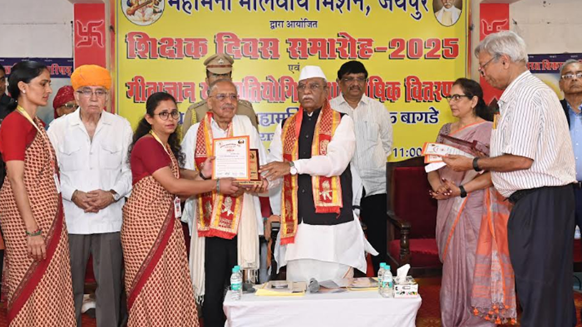 जयपुर। महामना मालवीय मिशन, जयपुर द्वारा शिक्षक दिवस का भव्य आयोजन आज माध्यमिक आदर्श विद्या मंदिर, मानसरोवर, जयपुर में उल्लासपूर्वक संपन्न हुआ। इस गरिमामयी समारोह का शुभारंभ कार्यक्रम के मुख्य अतिथि, महामहिम श्री हरिभाऊ बागडे , माननीय राज्यपाल राजस्थान द्वारा महामना पंडित मदन मोहन मालवीय जी की प्रतिमा पर माल्यार्पण एवं दीप प्रज्वलन के साथ किया गया। इस अवसर पर विशिष्ट अतिथि डॉ. जगदीश चंद्र एवं डॉ. नीलम माहेश्वरी, मालवीय मिशन के सदस्यगण, विद्यालय के आचार्यगण तथा जयपुर के अन्य प्रबुद्ध नागरिक उपस्थित रहे।
