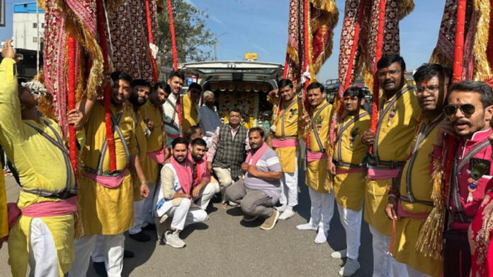 जयपुर। श्री श्याम भजन संध्या परिवार सेवा समिति की और से जयपुर से खाटूश्यामजी के लिए 8 वीं पदयात्रा चांदपोल हनुमान मंदिर से बैंड- बाजे के साथ धूमधाम से रवाना हुई। इस पदयात्रा में 51 यात्री बाबा श्याम की ध्वजाएं लेकर बाबा के जयकारे लगाते हुए रवाना हुए। इस मौके पर श्याम भक्तों को सुबह पंडितों ने विधिपूर्वक मंत्रोच्चारों के साथ धवजा एवं श्याम रथ का पूजन करवाया और गंगोत्री (उत्तराखंड) के महंत हरीश रावत ने आरती करके बाबा श्यामजी की इस धार्मिक पदयात्रा को रवाना किया।