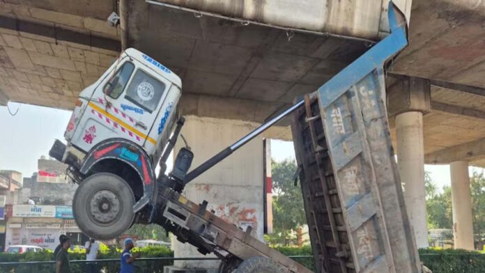 एलिवेटेड पुलिया के नीचे डंपर का पिछला हिस्सा अटका