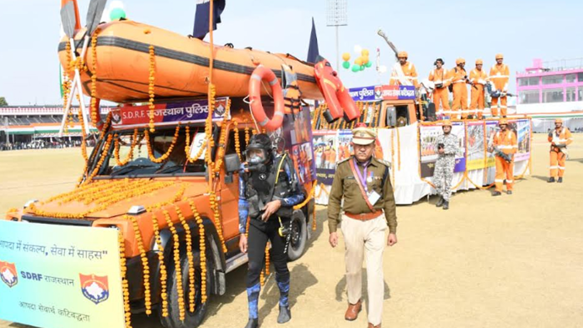जयपुर। गणतंत्र दिवस 2026 के अवसर पर एसएमएस स्टेडियम जयपुर में आयोजित राज्य स्तरीय मुख्य समारोह की परेड में राज्य आपदा प्रतिसाद बल (एसडीआरएफ) की झांकी का प्रदर्शन शामिल किया गया। इस झांकी में एसडीआरएफ की क्षमताओं और सेवाओं को प्रदर्शित किया गया। जिसकी थीम आपदा प्रबंधन में तत्परता,तकनीक,मदद और मानवीय संवेदना थी। एसडीआरएफ की झांकी कमांडेंट राजेन्द्र सिंह सिसोदिया के नेतृत्व में तैयार की गई। इसमें एसडीआरएफ के जवानों को शामिल किया गया।
