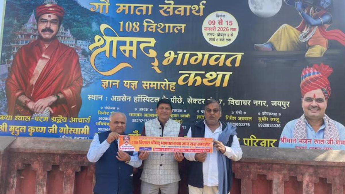 जयपुर। श्री गिरिराज संघ परिवार विश्वकर्मा जयपुर के 27 वें वार्षिकोत्सव पर 108 श्रीमद भागवत कथा ज्ञान यज्ञ समारोह आगामी 9 जनवरी से 15 जनवरी तक विद्याधर नगर,सेक्टर-7 स्थित अग्रसेन हॉस्पिटल के पीछे आयोजित किया जाएगा।
