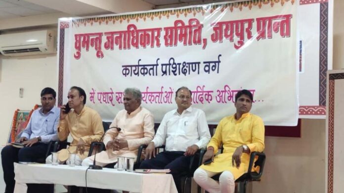 घुमंतु जनाधिकार समिति के प्रांत सह संयोजक राकेश बिडावत ने बताया कि वक्ताओं ने घुमंतू समाज के समग्र विकास, समाज के लोगों के दस्तावेज, आवास, शिक्षा एवं रोजगार के अवसरों पर विस्तृत जानकारी दी। राष्ट्रीय स्वयंसेवक संघ के वरिष्ठ प्रचारक तथा राजस्थान क्षेत्र के घुमंतु कार्य प्रमुख महेंद्र सिंह ने समाज के विकास के लिए योजनाबद्ध कार्य करने का आह्वान किया।