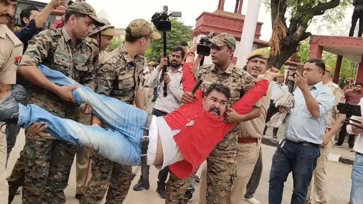 शुक्रवार दोपहर करीब 2 बजे शुरू हुए प्रदर्शन में कार्यकर्ता बैरिकेड्स पर चढ़ गए और नारेबाजी करते हुए अंदर जाने का प्रयास किया। पुलिस ने पहले से ही गेट पर बैरिकेडिंग कर रखी थी। स्थिति बिगड़ने पर पुलिस ने प्रदर्शनकारियों को नीचे उतारकर हिरासत में लिया और गाड़ियों में बैठाकर ले गई। कुछ कार्यकर्ता सड़क पर लेटकर विरोध जताते नजर आए।